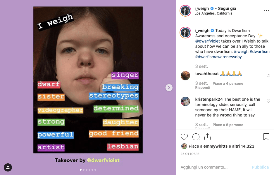 Su queste basi è nato, ad esempio, il movimento I Weigh, fondato dall’attrice e attivista Jameela Jamil, che ha coinvolto su questo fronte diverse personalità del mondo dello spettacolo.