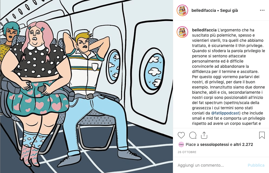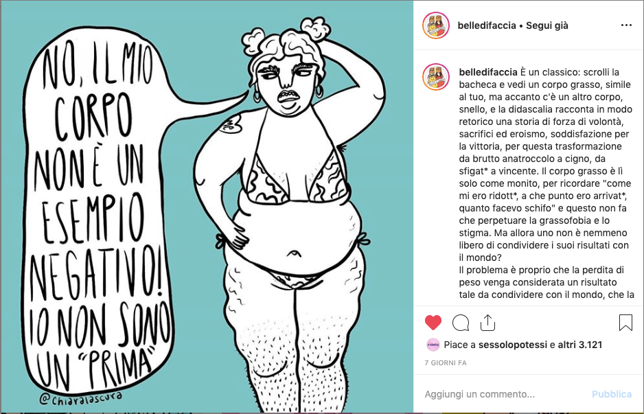 Un account Instagram italiano che si occupa di fare sensibilizzazione e cultura sulla body positivity è @belledifaccia: